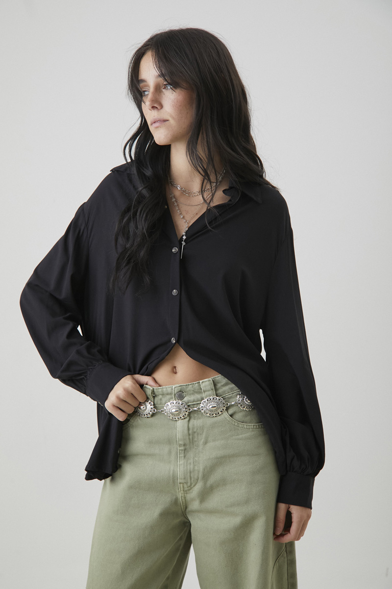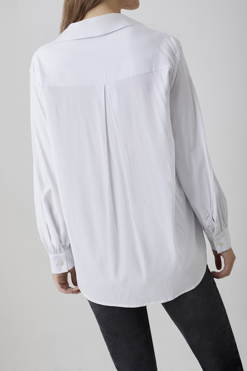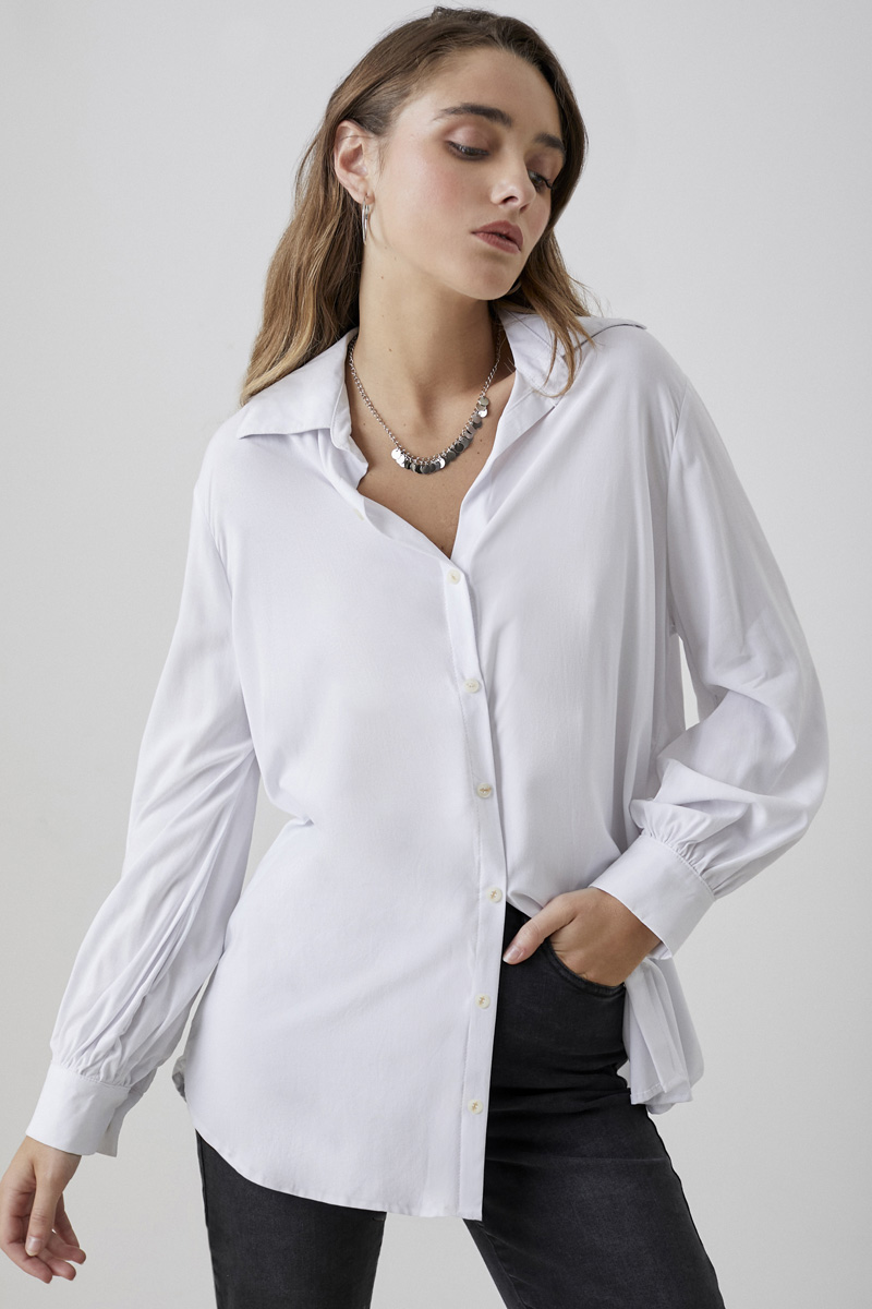 | Camisa con manga globo y canesú en espalda. Textil: Fibrana elastizada. Composición: 95% rayón, 5% elastano. |