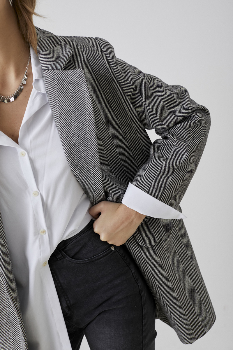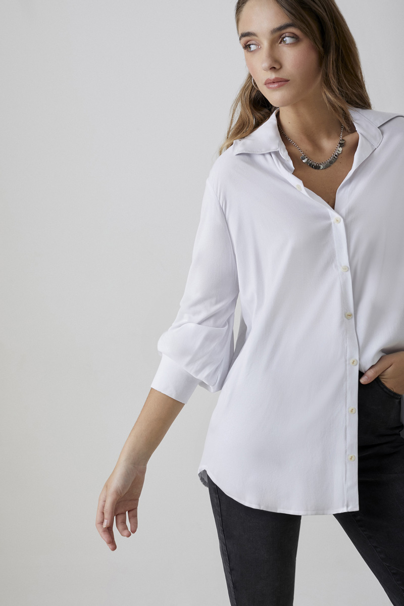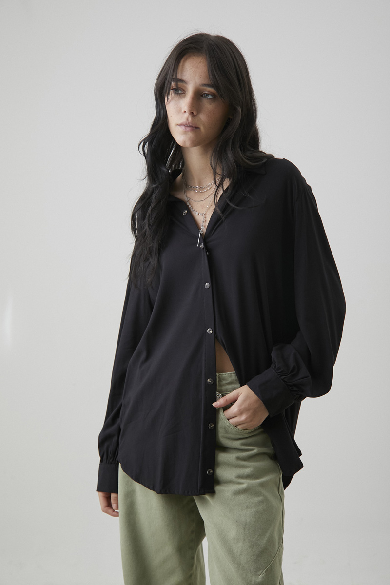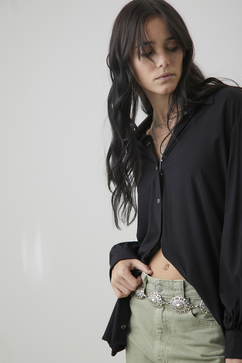 | Camisa con manga globo y canesú en espalda. Textil: Fibrana elastizada. Composición: 95% rayón, 5% elastano. |