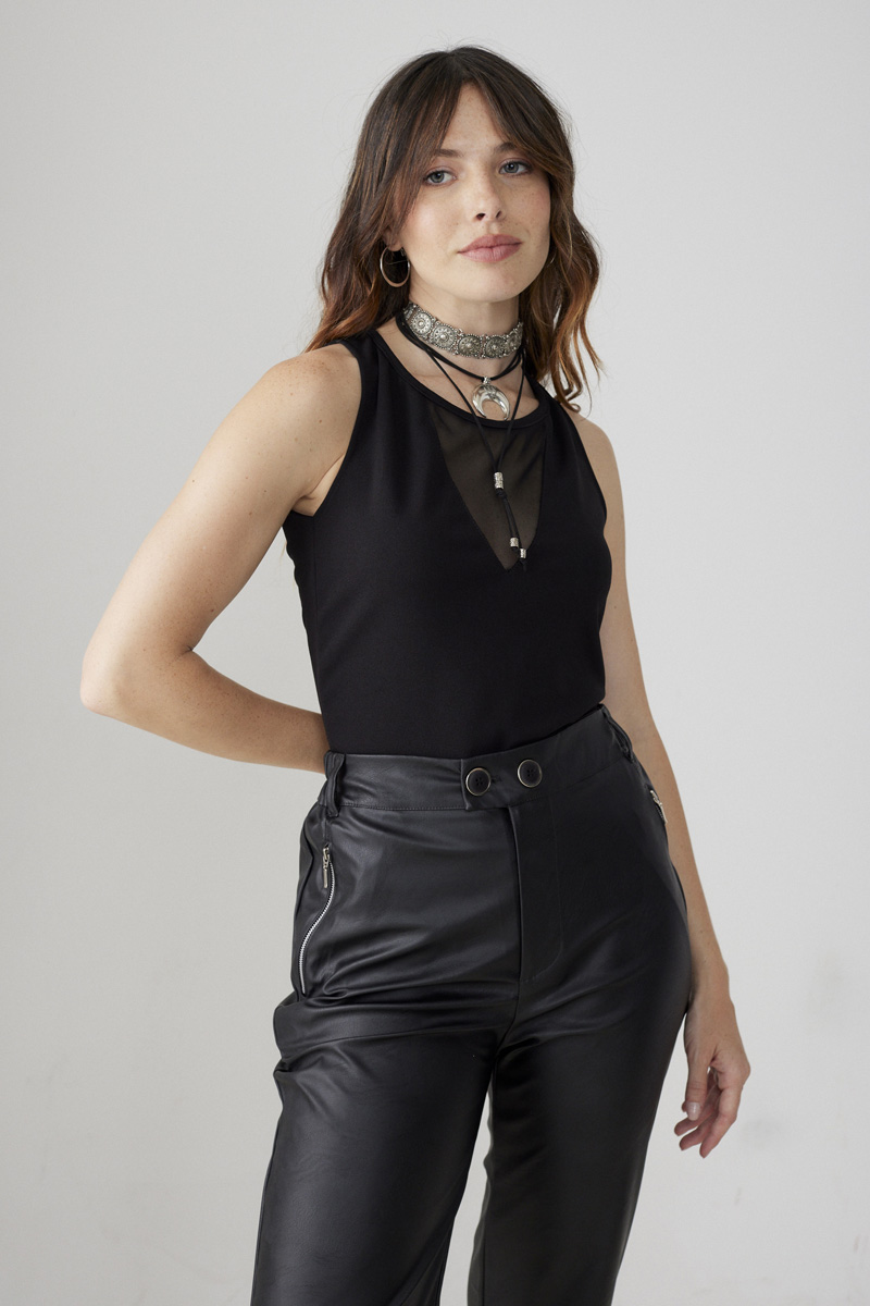 ESTE PRODUCTO ES DE OUTLET-DISCONTINUO- OTRAS TEMPORADAS SE CAMBIA UNICAMENTE POR PRENDAS DE GARAGE SALE Body con cuello redondo con detalle de combinación textil. Espalda descubierta. Textil: Creppe y combinación con tul de lycra. Composición: 95% poliester, 5% elastano. |