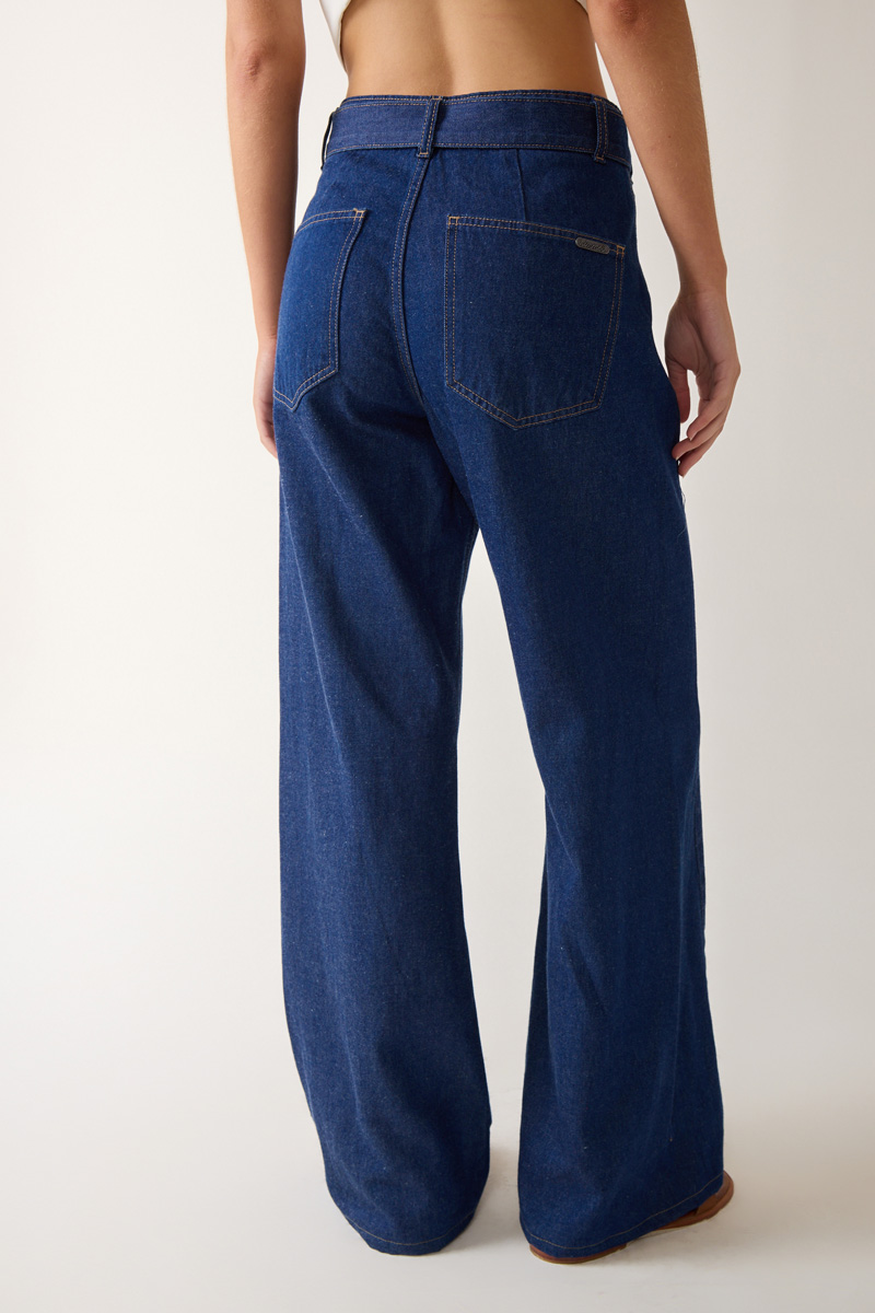 Jean wide leg de tiro alto con alforzas centrales que estilizan la figura.