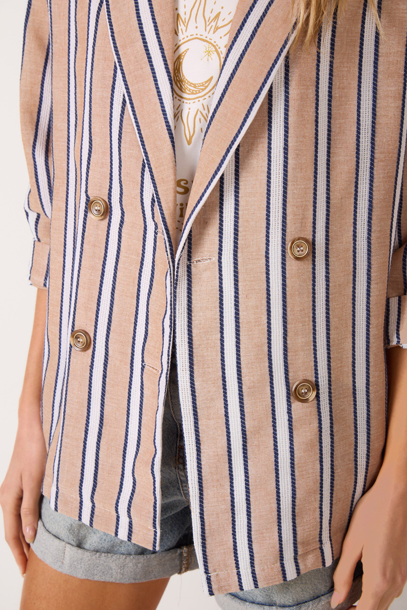 Blazer sastrero de silueta relajada con mangas anchas y botones ocultos en cartera, un ítem versátil y sofisticado que eleva cualquier look. Confeccionado en lino rayado, aporta frescura y un estilo actual con aire mediterráneo. Su diseño combina elegancia y comodidad, ideal para usar tanto en el día como en la noche.