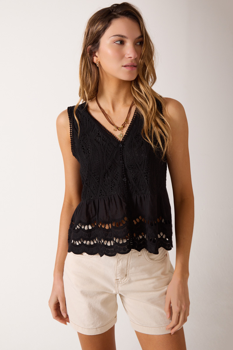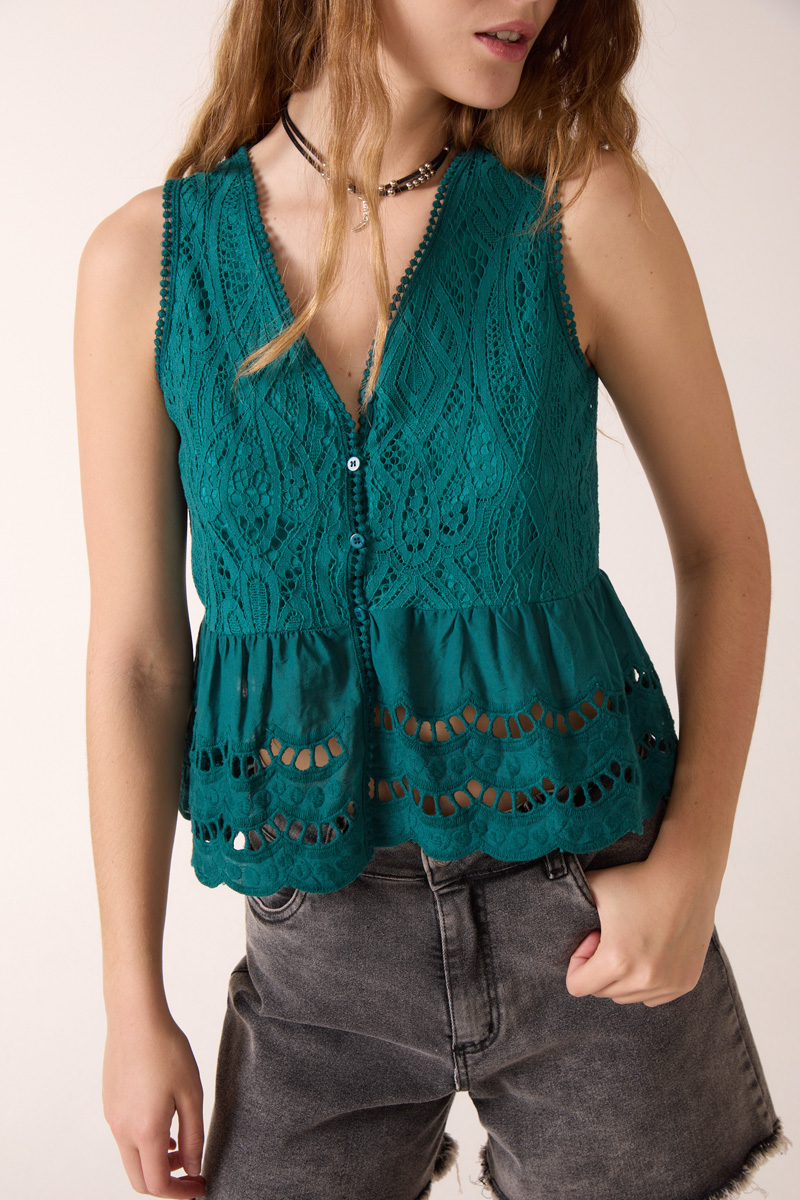 Blusa con cartera de botones central y detalle de puntilla en sisas.