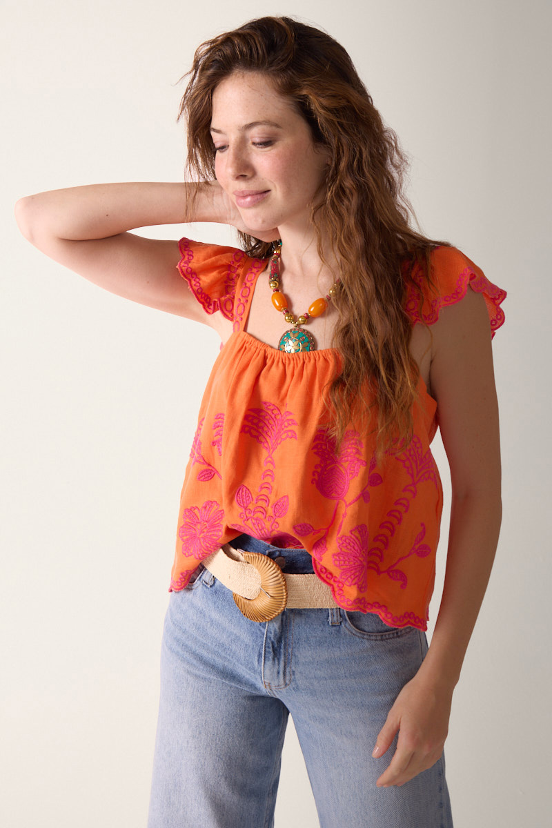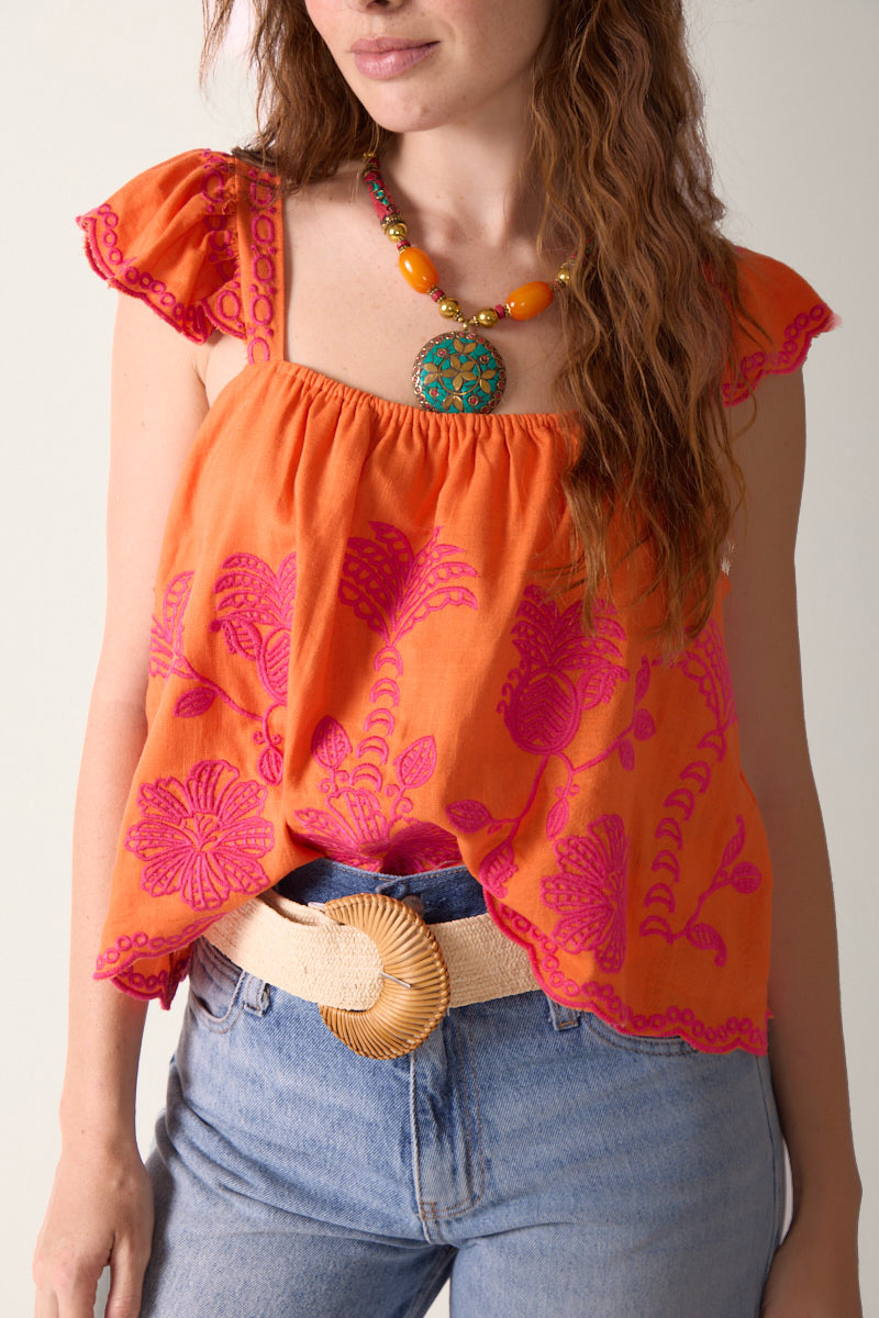 Blusa bordada con detalle de volados en breteles y terminación en ruedo.