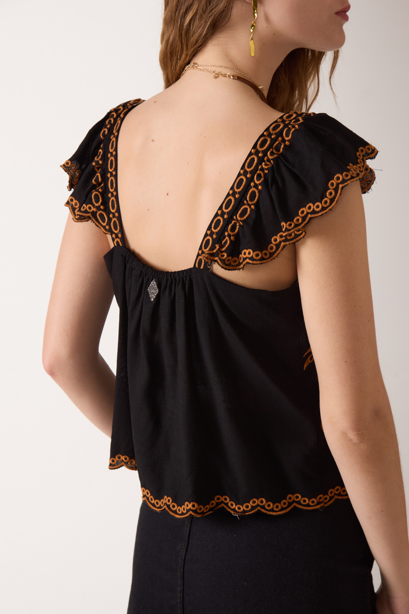 Blusa bordada con detalle de volados en breteles y terminación en ruedo.