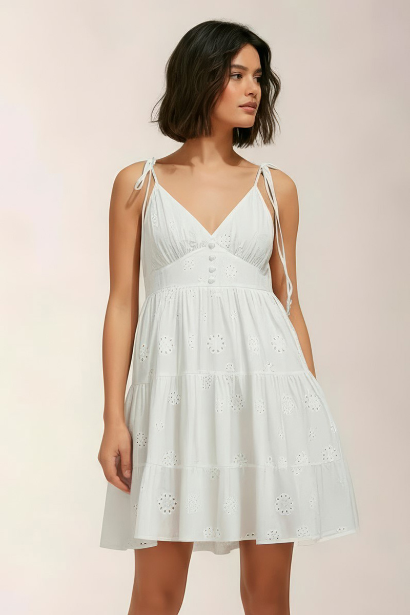 Vestido escote en "V" de volado con detalle de botones en centro de busto. Breteles regulables y espalda con elástico "nido de abejas".