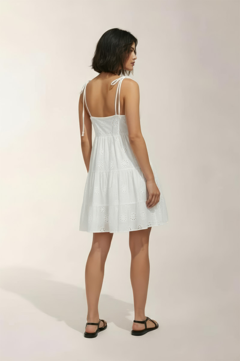 Vestido escote en "V" de volado con detalle de botones en centro de busto. Breteles regulables y espalda con elástico "nido de abejas".