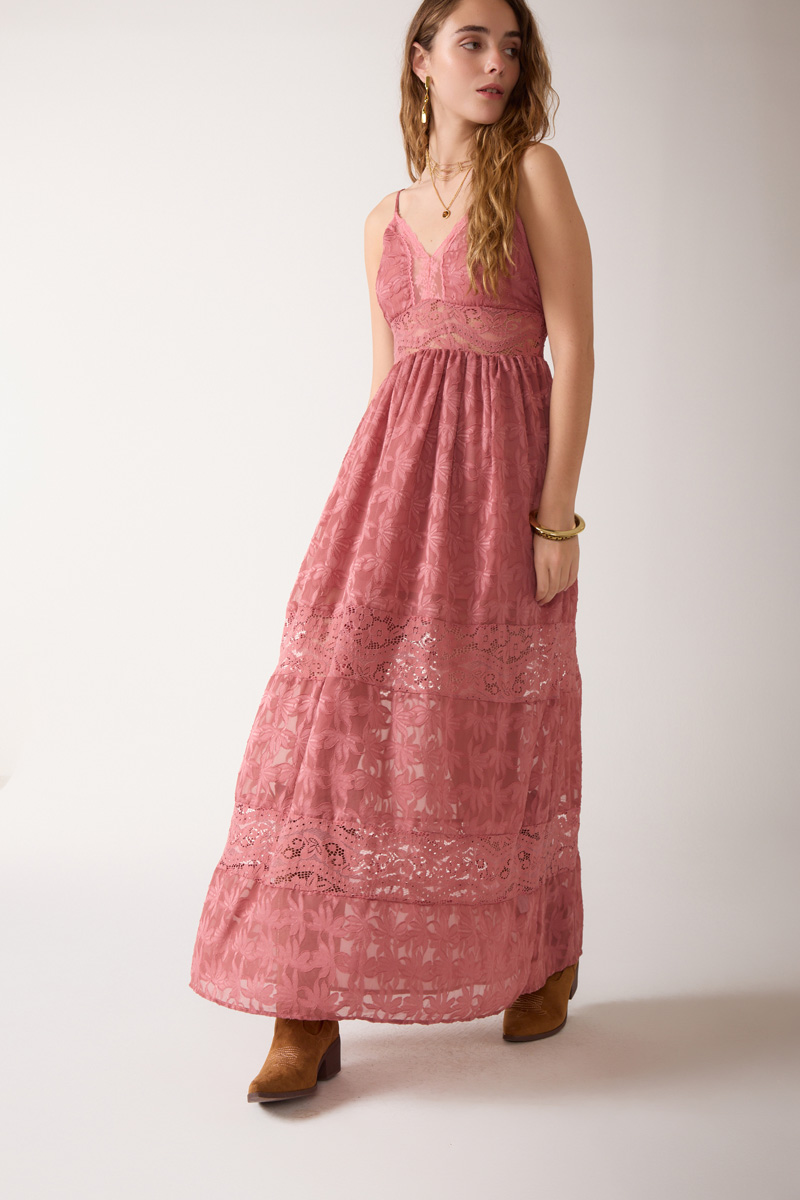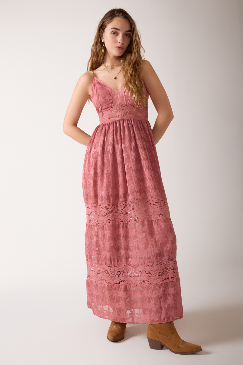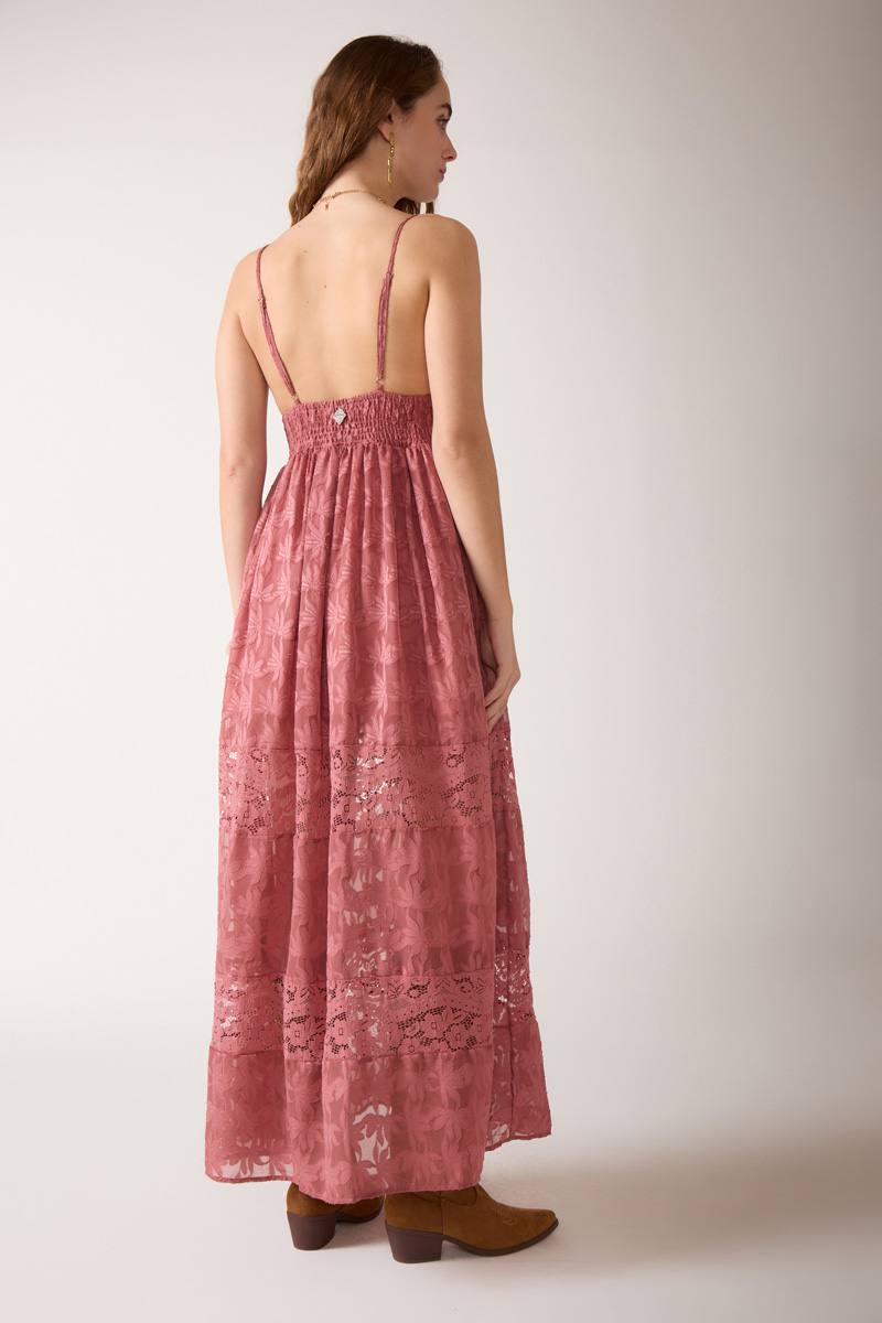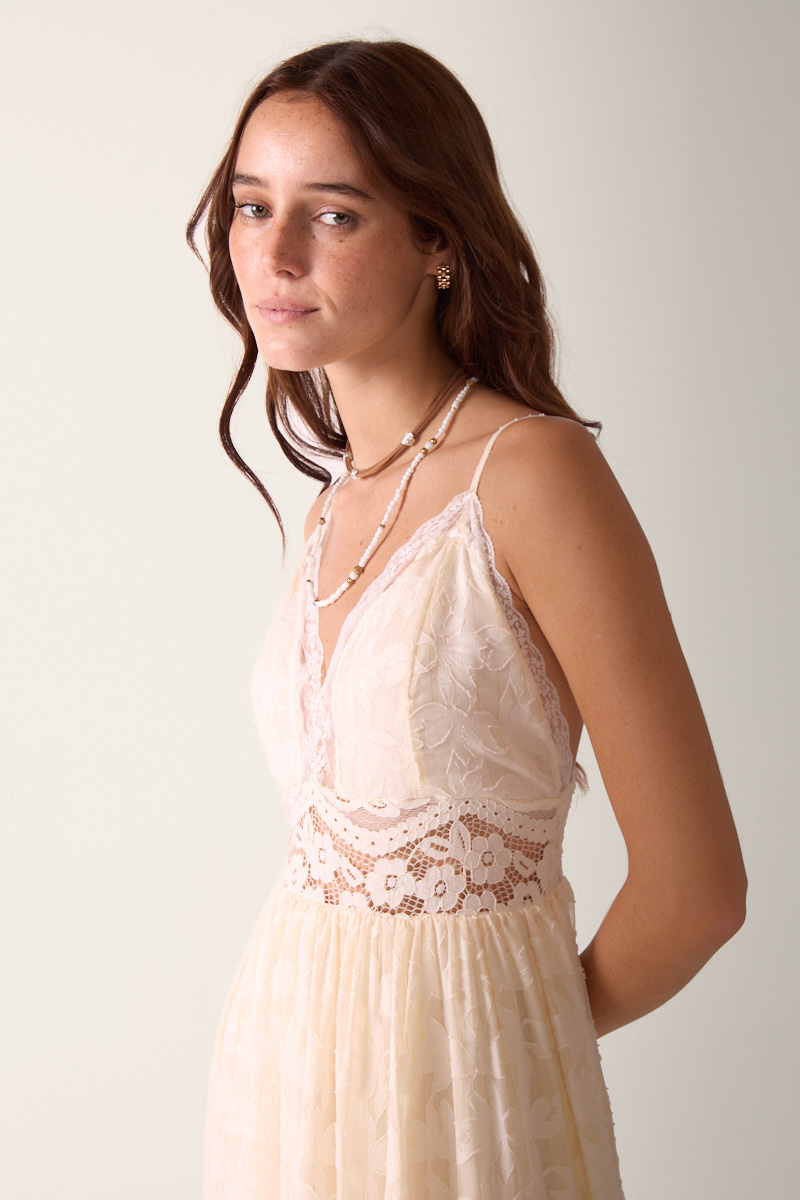 Vestido escote en "V" con detalle de encaje en escote y cintura. Breteles regulables y espalda con elástico "nido de abejas".