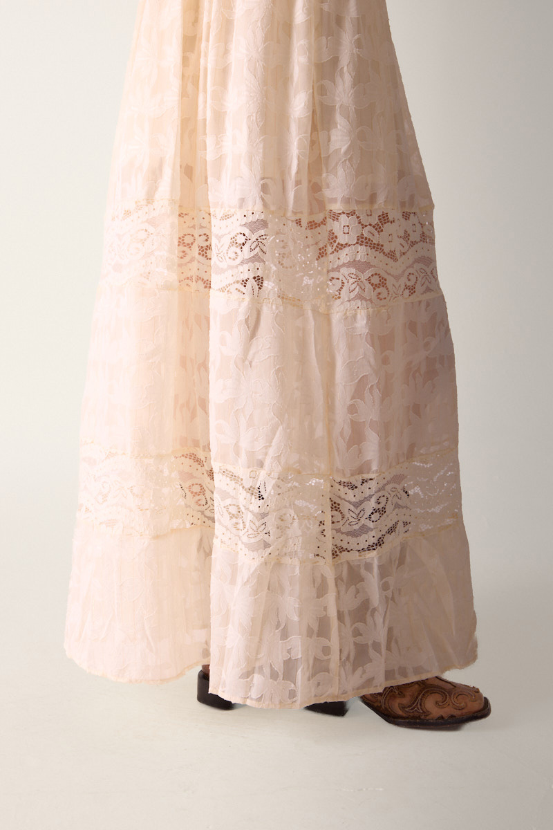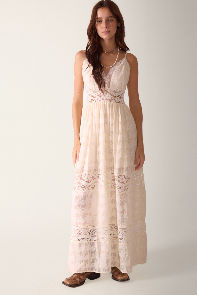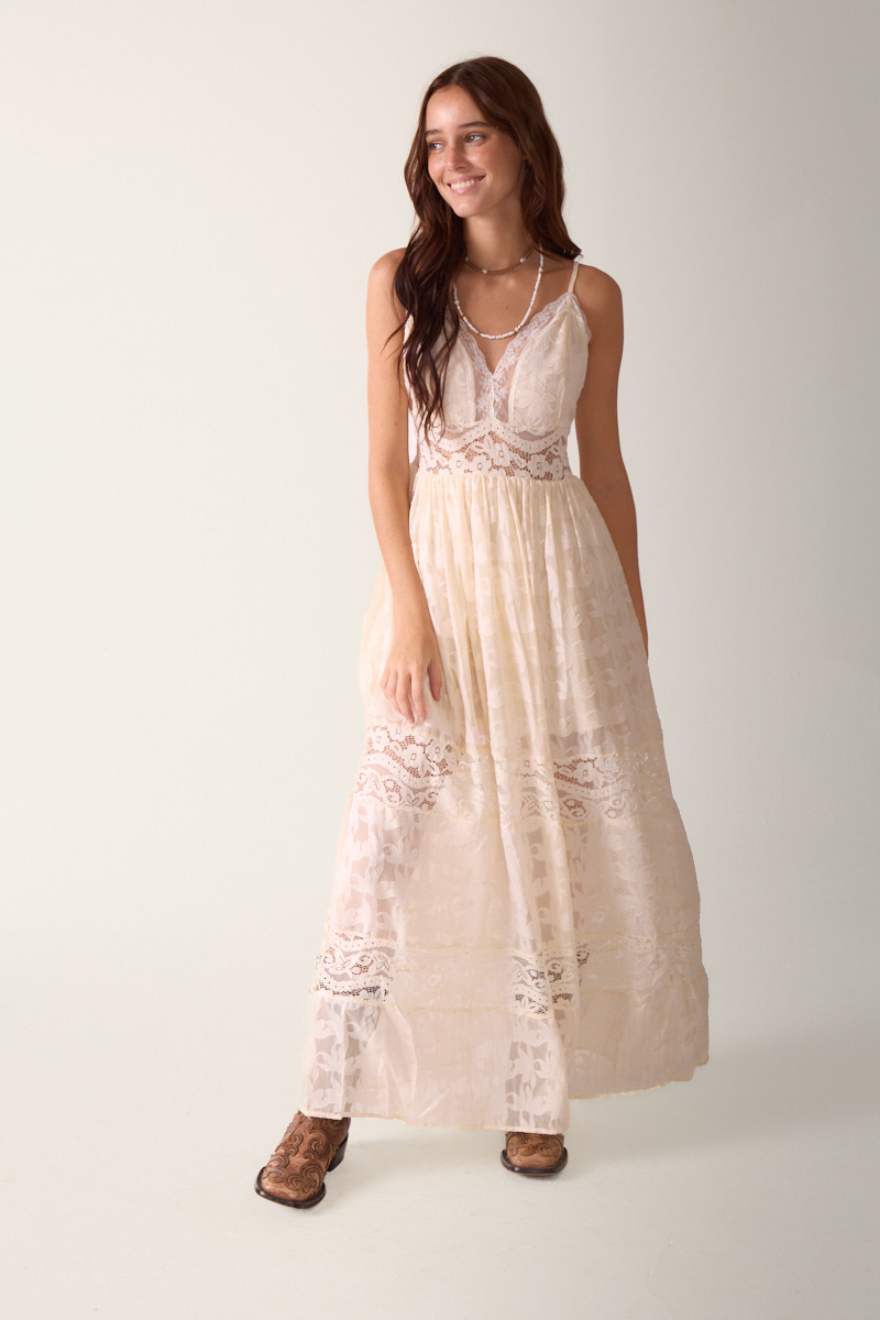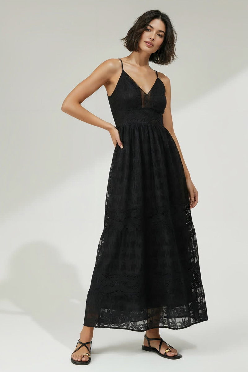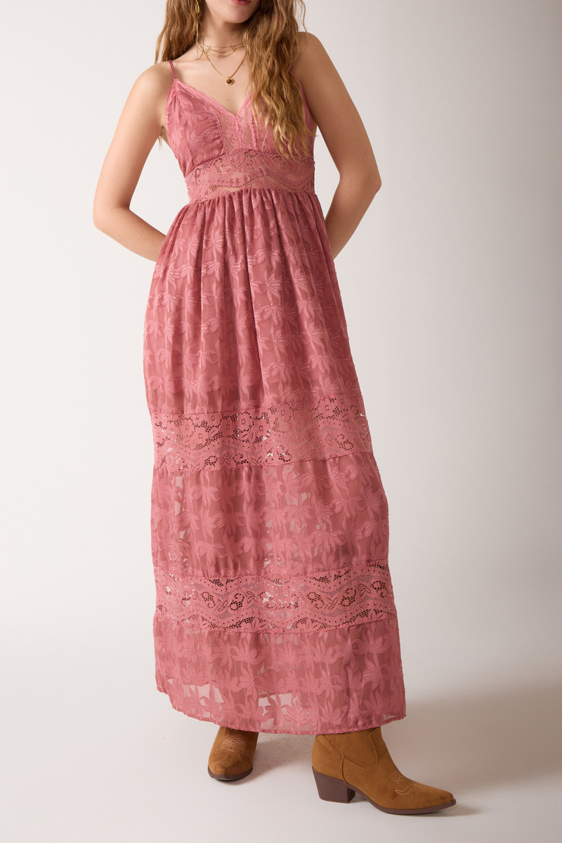 Vestido escote en "V" con detalle de encaje en escote y cintura. Breteles regulables y espalda con elástico "nido de abejas".