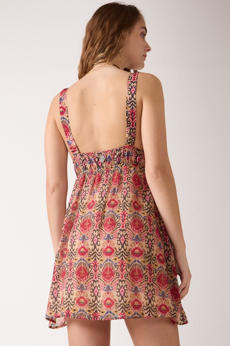 Vestido escote en "V" con detalle de piedras en breteles, lazo en bajo busto y elástico en cintura.