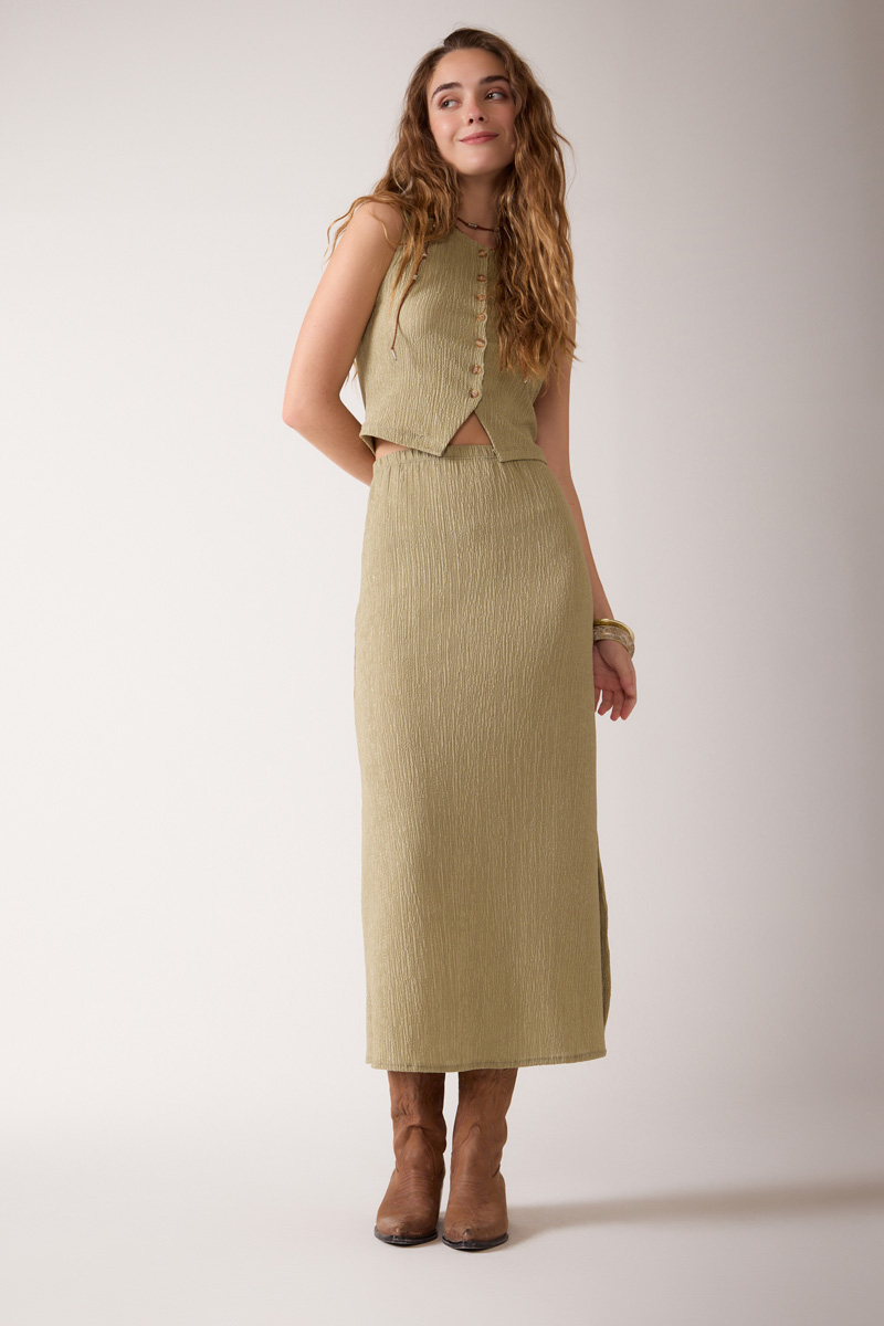 Falda con elástico en la cintura que se adapta perfectamente a tu silueta y tajo lateral que aporta un toque moderno y femenino. Ideal para lograr un look cómodo, fresco y con estilo tanto de día como de noche.