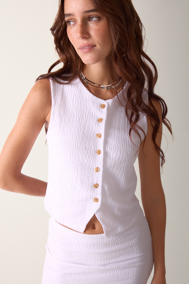 Blusa con cartera de botones frontal, confeccionada en bambula de punto con caída suave y textura liviana.