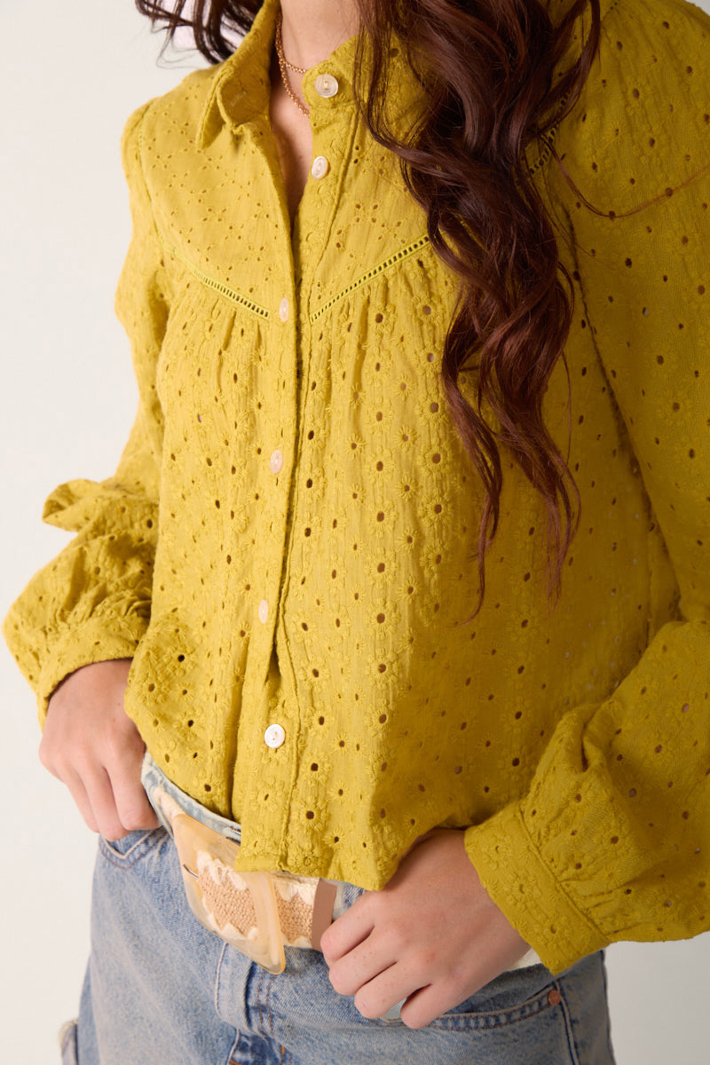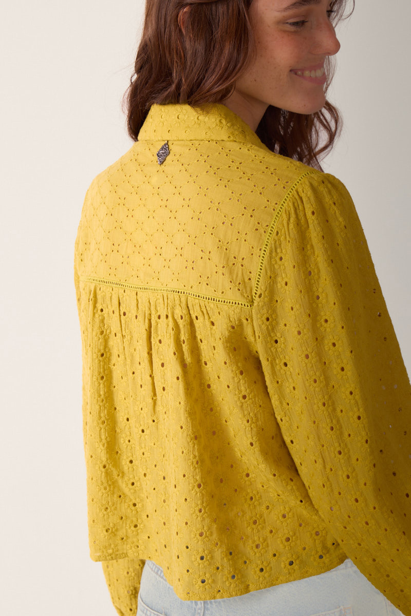 Camisa de broderie 100% algodón, con delicado detalle de puntilla en el delantero y cartera de botones central.