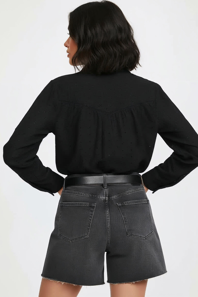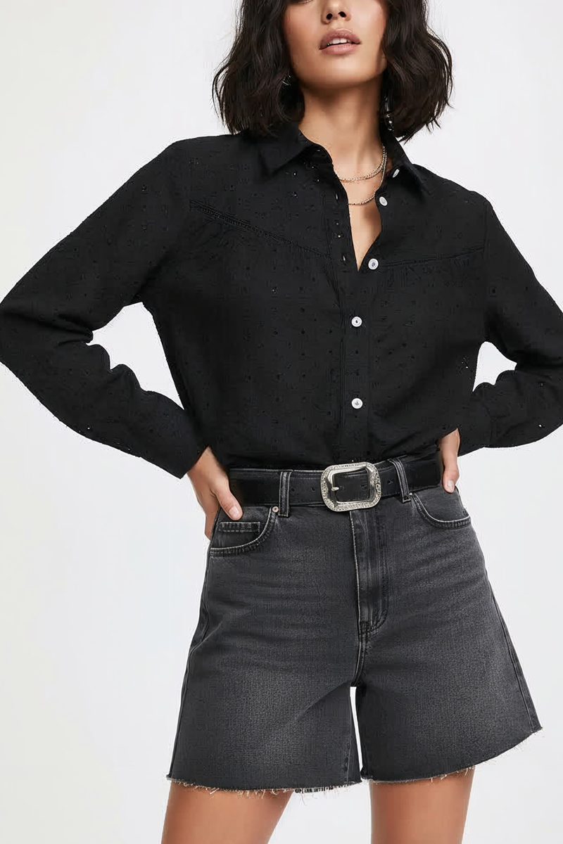 Camisa de broderie 100% algodón, con delicado detalle de puntilla en el delantero y cartera de botones central.